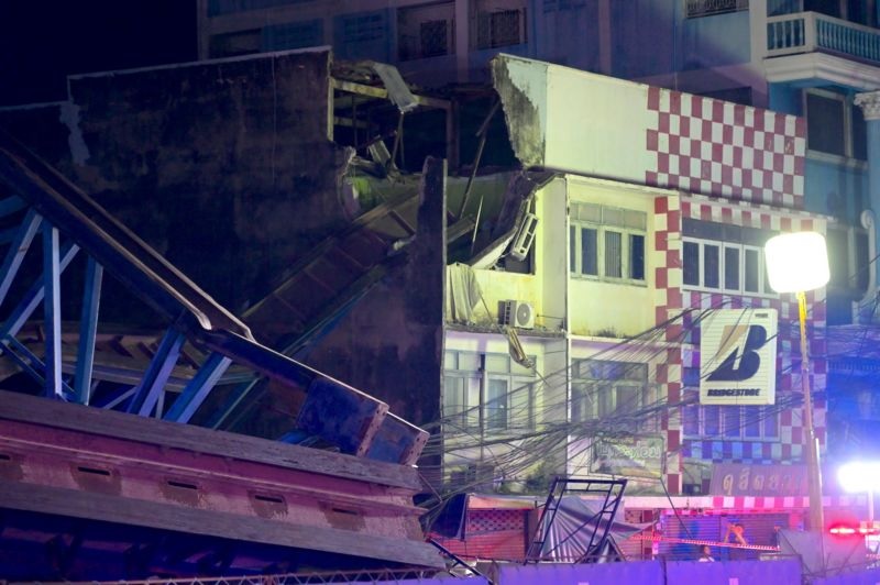 報告によると、ロータス・ラートクラバン店前の交差点で、建設中の高架道路が400メートル近くに渡り倒壊して車などが下敷きになり、一部の隣家に大きな被害も出たとのことです。