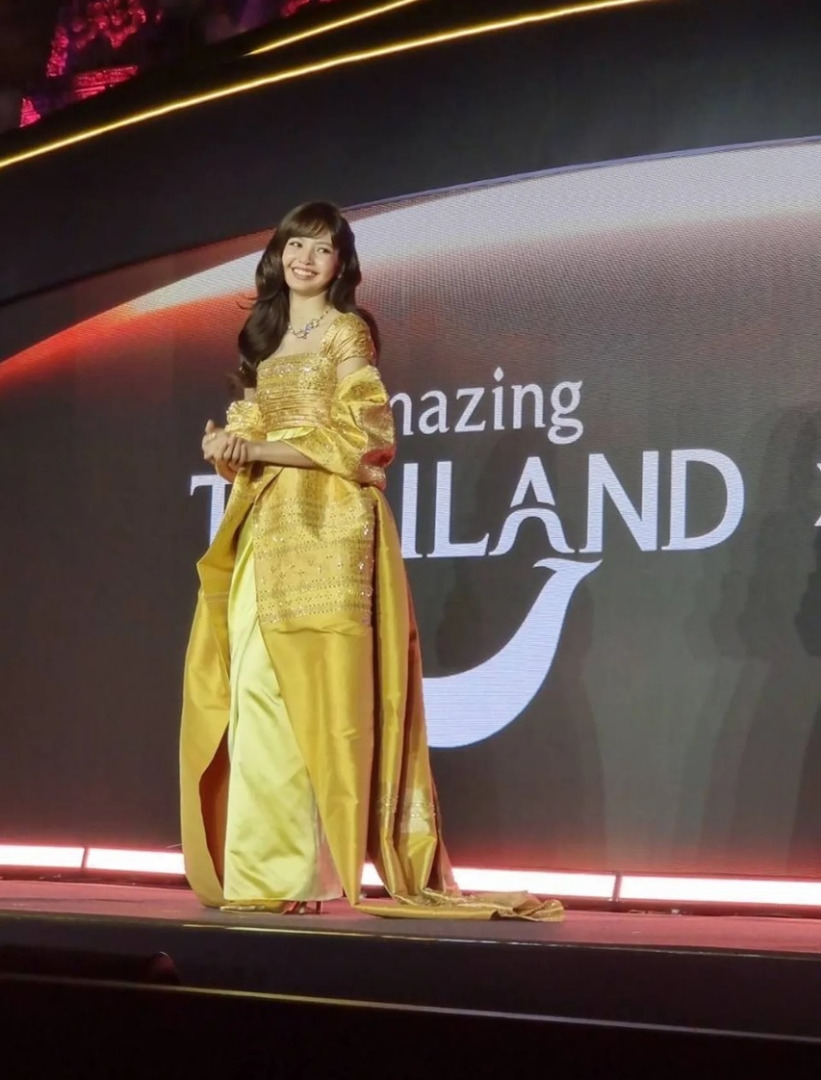 会場となったワット・アルンにて、リサさんは金色の現代風タイ衣装を身にまとい登場しました。ライトアップされた壮麗な仏塔を背景に、その優雅な姿は集まった人々を魅了しました。