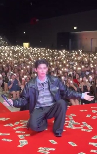 プーウィンさんは、バースデーケーキを手にステージへ現れ、ポンドさんを驚かせると同時に、会場のファンから大歓声を浴びました。
