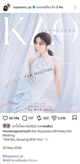 タイの人気女優であるカオ・スパッサラー・タナチャート(Kao Supassara Thanachat)さんのバースデーファンミーティングが、2026年5月2日(土)に開催されることが発表されました。